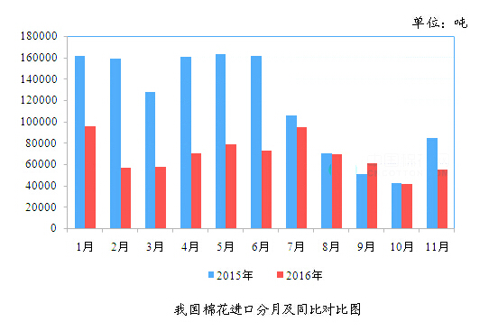據(jù)中國海關總署統(tǒng)計,2016年11月,我國進口棉花5.50萬噸,環(huán)比增加1.36萬噸,增幅32.99%;同比減少2.95萬噸,減幅34.92%;2016年1-11月,我國累計進口棉花75.12萬噸,同比減少53.47萬噸,減幅41.58%。2016/2017年度,我國累計進口棉花15.70萬噸,同比減少2.06萬噸,減幅11.59%。